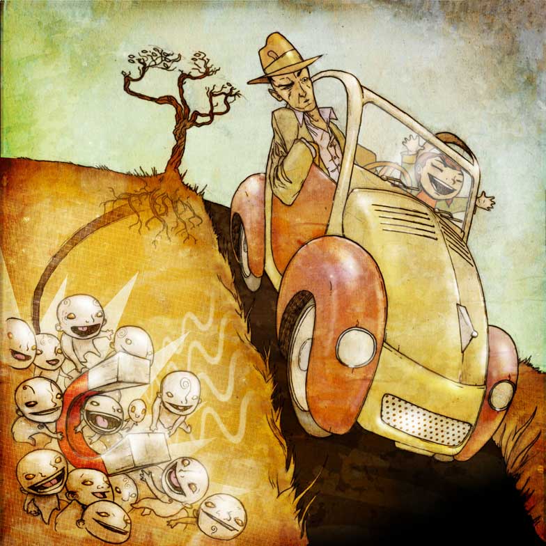 This is my piece from the Allied Irish Bank 2009 Calender. They had a selection of Irish illustrators create something based on a place/location of hidden interest. I picked a hill hidden amongst the Comeraghs, near the Mahon Falls, somewhere in County Waterford. This hill reputedly has the curious ability to cause an idle car to roll uphill. Prints available