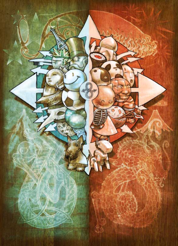 This is a piece for an Asics campaign. The various illustrations in the series of ads each feature two sides or opposites. As well as Art/Science and Up/Down there was my version of East/West. Each hemisphere gets half of a compass chocked full of various cultural elements. |