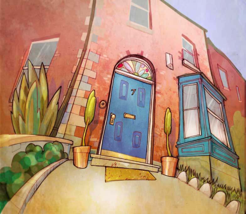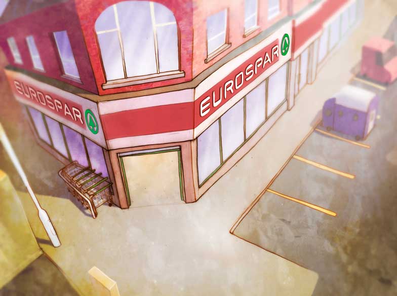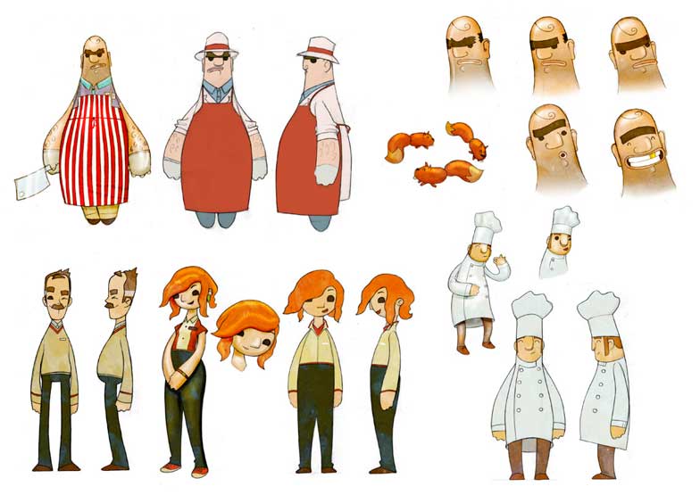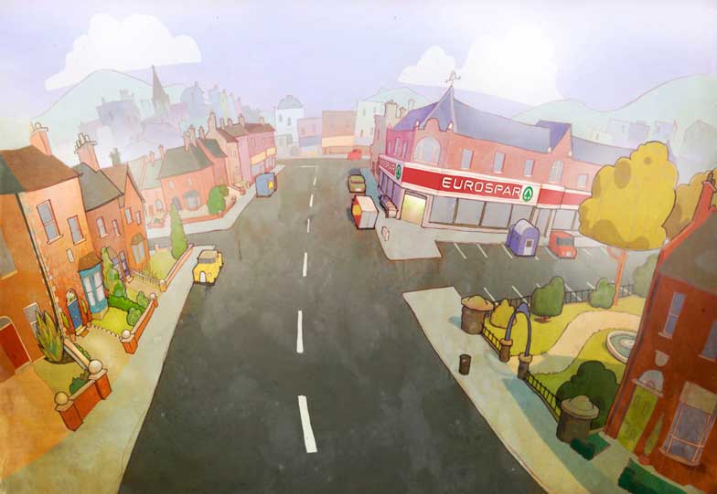 I designed the characters and backgrounds for an animated ad for Eurospar. Here's a selection of some of the work from early character designs to finished backgrounds. All this (and a lot more) was taken by some incredibly skilled folk and turned into the moving world in the finished ad at the bottom of the page. |
