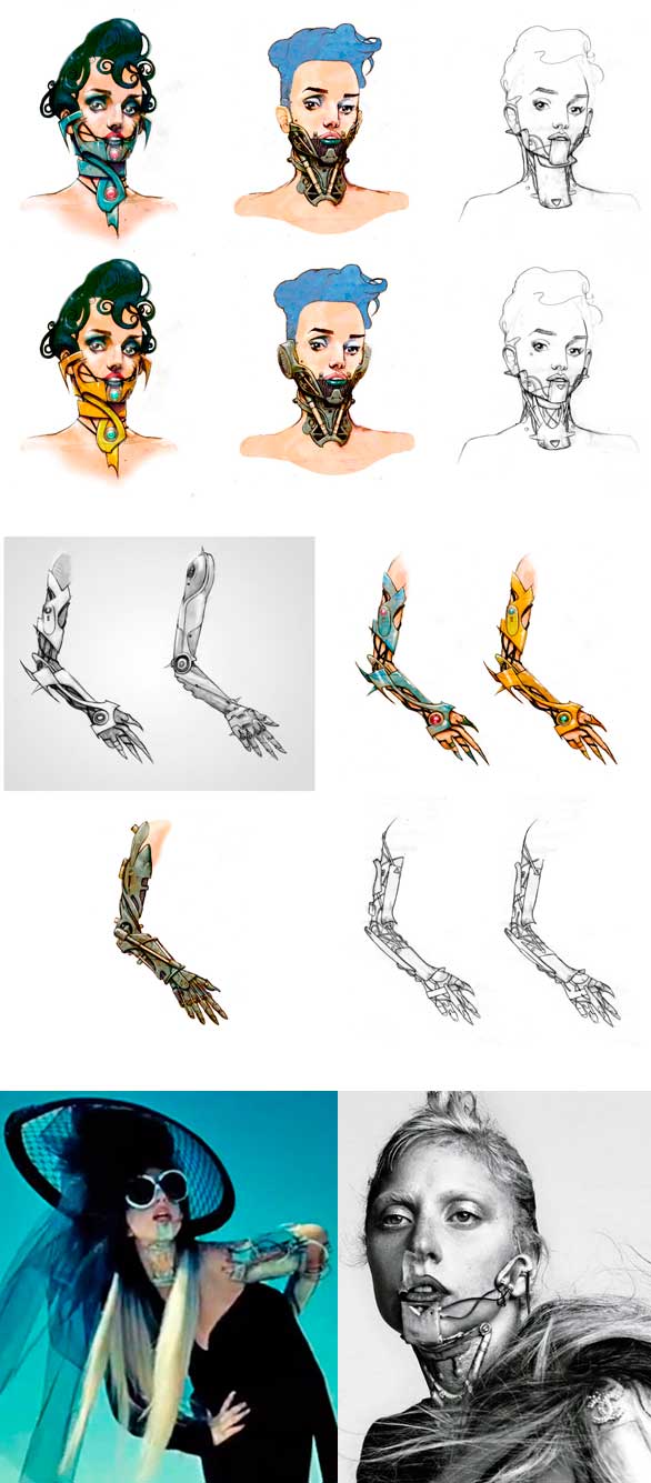 Millenium fx who were working on some prosthetics for Lady Gaga's video "Yoü and I". I was mainly concerned with designing her cyborg parts. After my initial drawings all the real work was done by the sculptors and the folks on the shoot, but I like that the weird chin block made it into the final video.