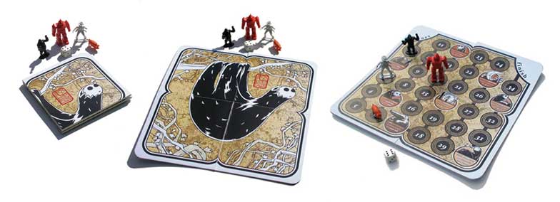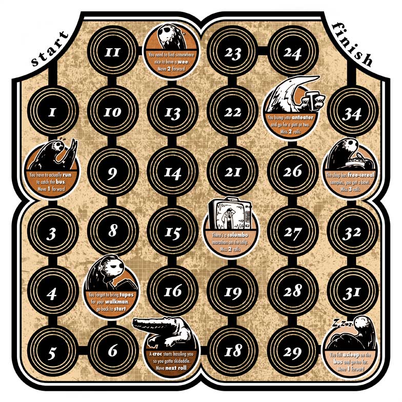 As part of the 2006 Dublin Fringe Festival's Vending Machine Project I produced ten boardgames based around my character, the Sloth. Due to the nature of the sloth, the object of the game was to be the last to finish. On the opening night they were one of the first pieces to sell out, confirming laziness as a popular pasttime. |